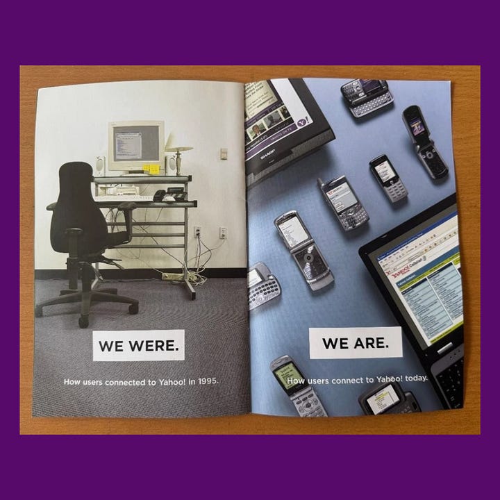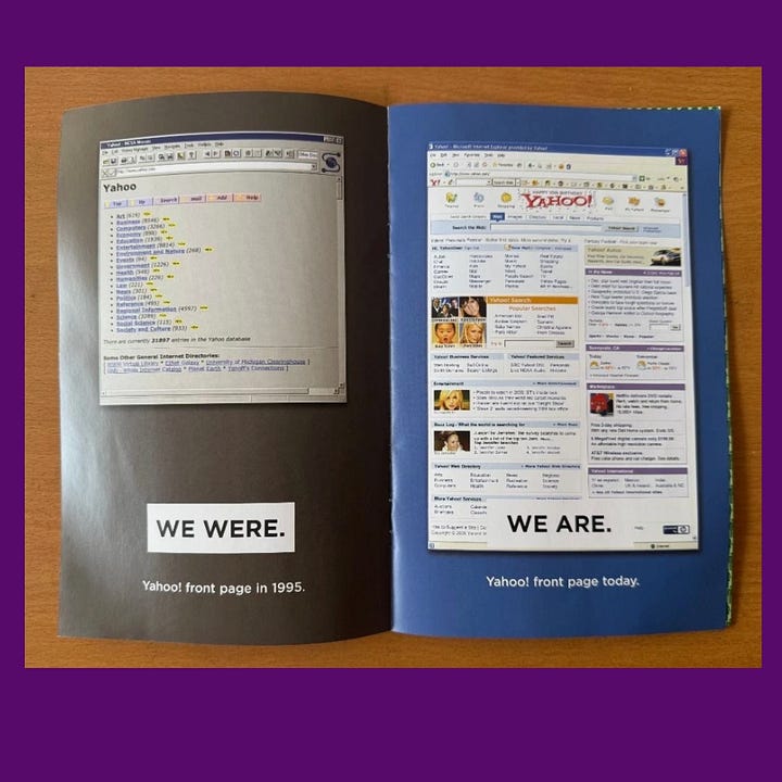 A decade later, in 2005, Yahoo was boasting hundreds of millions of monthly users and a £50bn market cap, owning their moment like the Motorola RAZR in their tenth anniversary book. In the middle of the story they looked immortal. Then they didn’t.