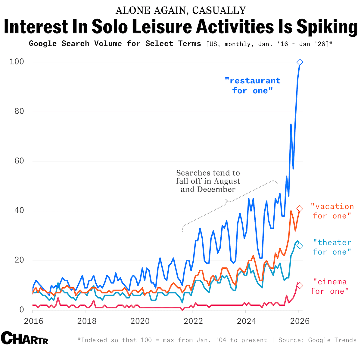 But this graphic from Chartr complicates the tidy and disenchants the empowerment. Searches for “restaurant for one”, “vacation for one”, “theatre for one”, “cinema for one” have all been ascending. The incline of the slope is the plume of smoke from the wreckage, a few people discovering solo leisure would be one thing, a culture visibly tilting their blooms towards that sun is another thing entirely.